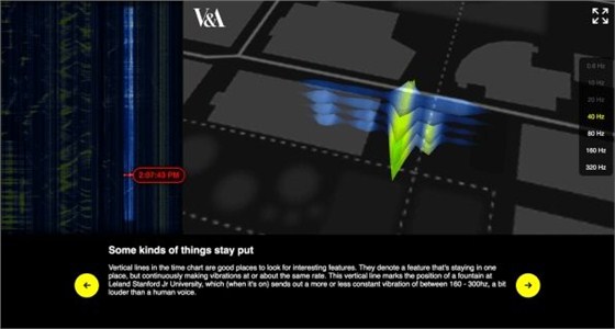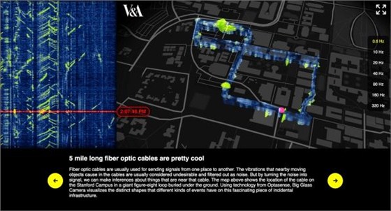 这种可视化,即“Big Glass Microphone”能够在十分钟以内把电缆中的数据提取出来,这些电缆以倾斜向一边的8字形状埋在地下6英寸深处。从可视化数据图中,我们很容易可以看到三种不同程度的振动波动,分别是汽车、大型喷泉和自行车行人造成的波动。受全球最大装饰和设计艺术馆维多利亚和阿尔伯特博物馆(Victoria and Albert Museum)的委托,这项可视化工程将会于2018年在馆内展示。